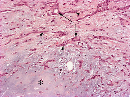 juosteina stroomaan (nuolenkärjet). Stroomassa on rustometaplasiaa (*). 100x suurennos, HE-värjäys.