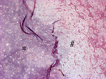 Korvasylkirauhasen tuumorissa epiteliaalinen solukko muodostaa pieniä tiehyitä ja kystia. Stroomassa on tavallisesti sidekudoslima-aineita (#, "myxoid") ja rustometaplasiaa (*). 40x suurennos, HE-värjäys.