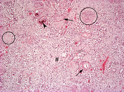 Njurens struktur är helt förändrad. Glomerulerna har hyaliniserats (ringar), blodkärlens väggar har förtjockats och hyaliniserats (pilar). I interstitium finns tydlig inflammatorisk vävnad. Dessutom förekommer ärr i interstitium (#). Ställvis ser man också förkalkningar (pilspetsar).